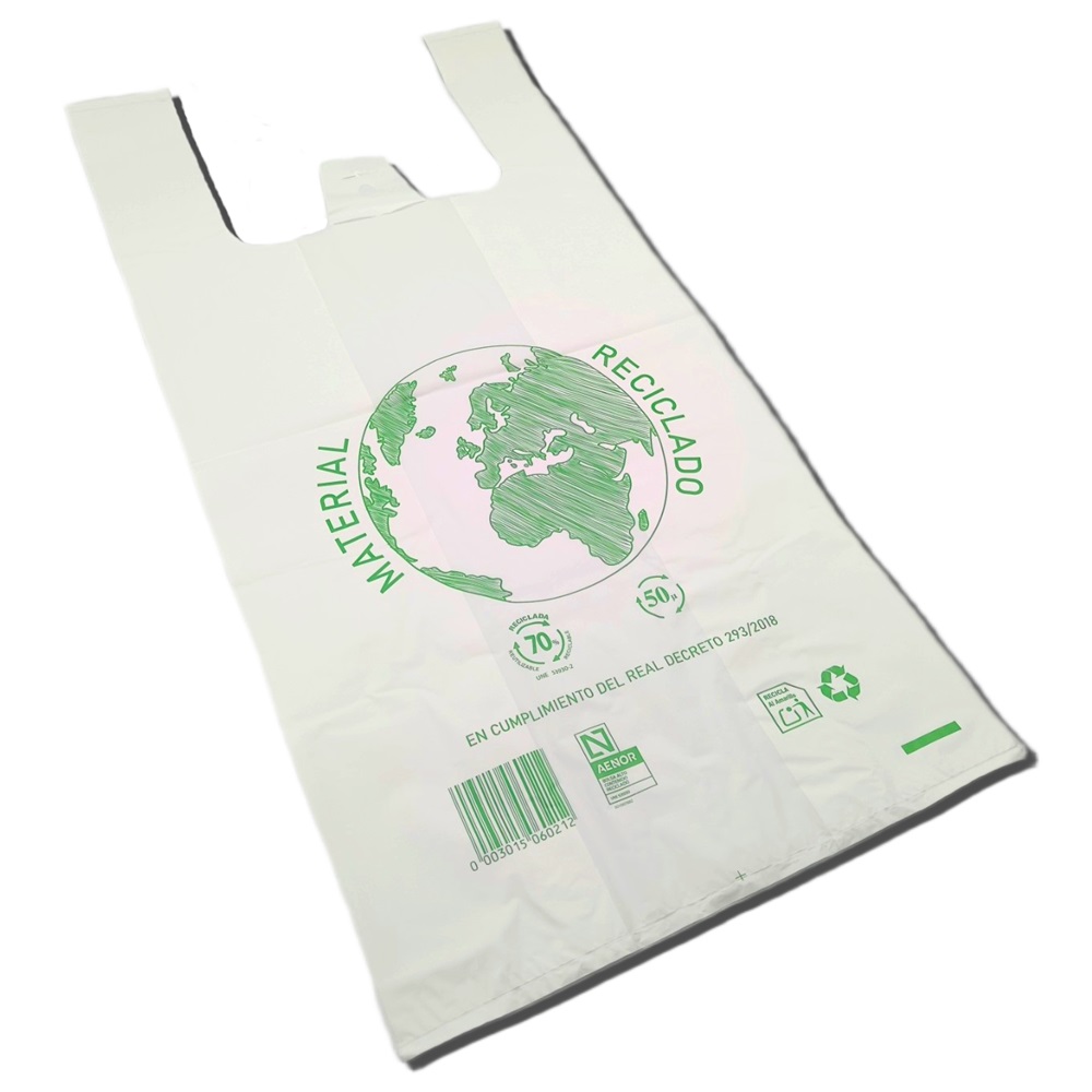 Bolsa blanca con asa de camiseta fabricada con material reciclado según normativa vigente. Paquete de 1 kg que contiene 35 bolsas aproximadamente